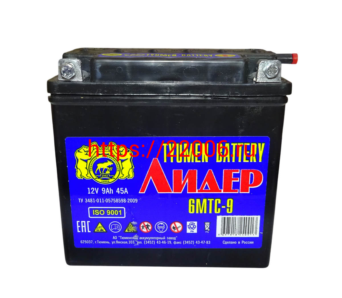 Аккумулятор 12В 9 А/ч, г.Тюмень Лидер (6МТС-9) под болт(140х75х135) обрат. пол., Кислот. Сухозарядж